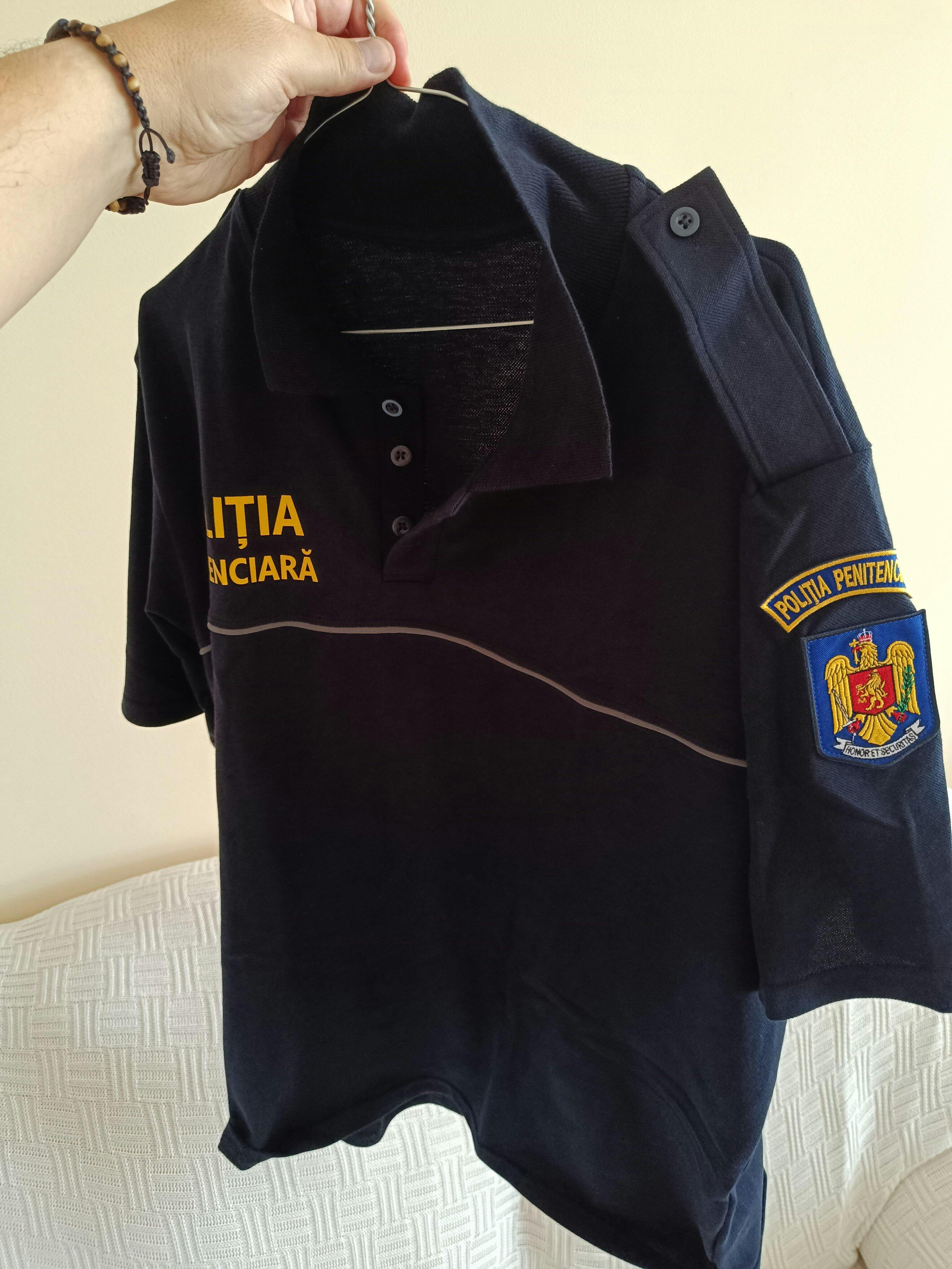 Detaliile precum vipușca gri aplicată la îmbinarea platcului de față cu pieptul, epoleții pentru suportul de grad pe umeri și inscripționarea cu vopsea galbenă - POLITIA PENITENCIARA - pe piept, aduc un plus de autenticitate și profesionalism tricoului. Ecusoanele rotunde și în formă de scut de pe mâneca stângă completează aspectul uniformei, evidențiind apartenența la instituția respectivă și respectând standardele de uniformitate și identitate vizuală. Acest tricou reprezintă nu doar o piesă vestimentară, ci și un simbol al autorității și profesionalismului polițiștilor, fiind realizat cu atenție la detalii și respect pentru tradiție.